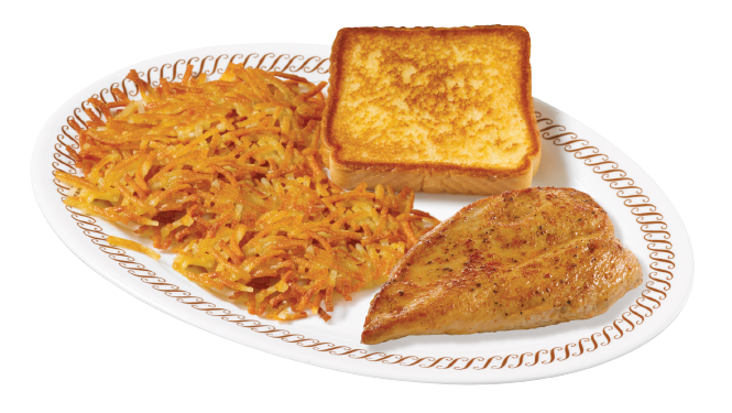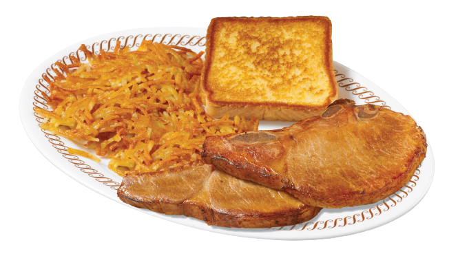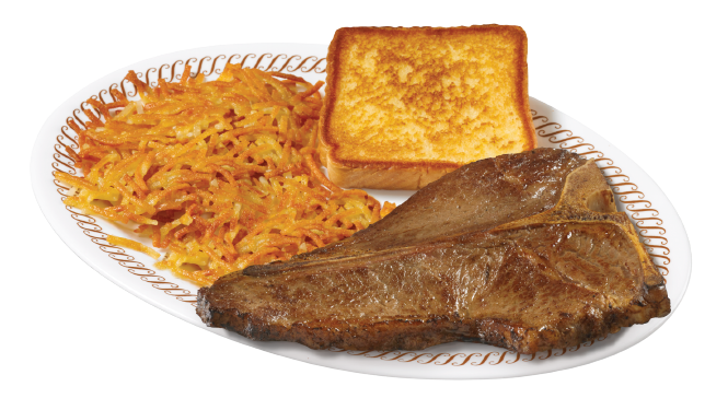 All of Waffle House's Classic Dinners consist of a choice of meat along with a large side of hashbrowns or grits, and a choice of toast. The selection of meats ranges from T-bone steak, sirloin steak, grilled chicken, grilled pork chops, and country ham. The toast options are Texas toast, white toast, wheat toast, biscuits, and raisin toast. All of these dinners come with a choice of 8 sides too: grilled onions, American cheese, smoked ham, grilled tomatoes, jalapeno peppers, grilled mushrooms, sausage gravy, and Bert's Chili.